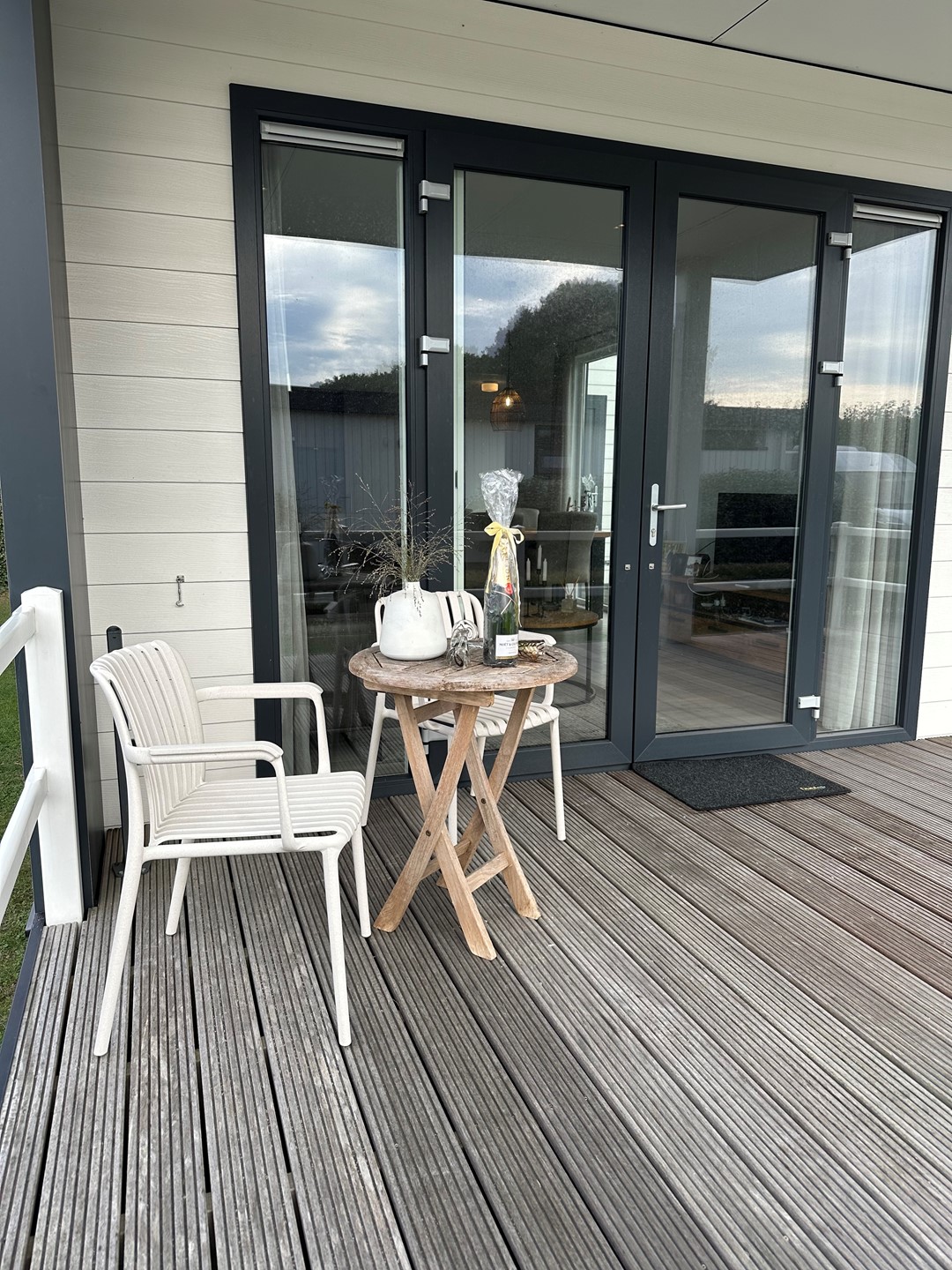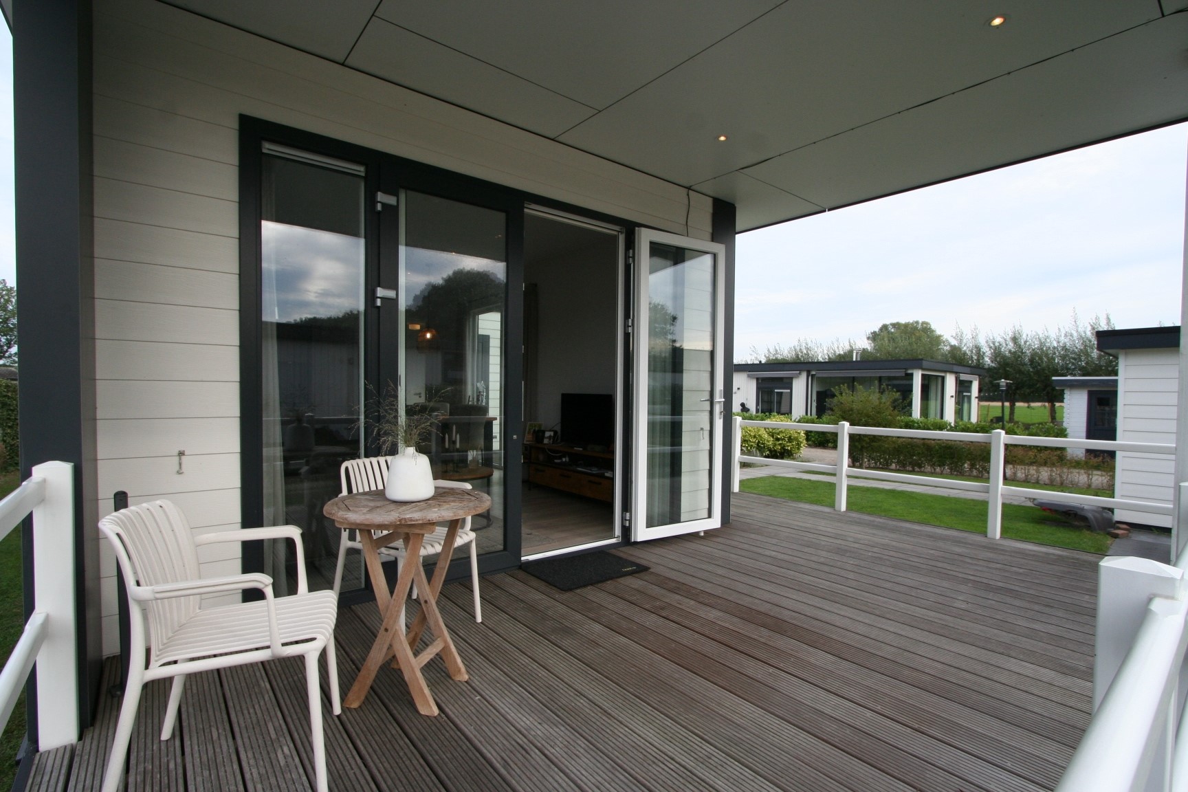 Buiten is alles keurig uitgevoerd met onderhoudsvriendelijke kwaliteitsmaterialen zoals kunststof deuren, Novicell kunststof gevelbekleding in houtlook, HPL platen en boei-delen en een in hardhout uitgevoerde veranda welke nog kan worden voorzien van glazen wanden als ware het een serre.